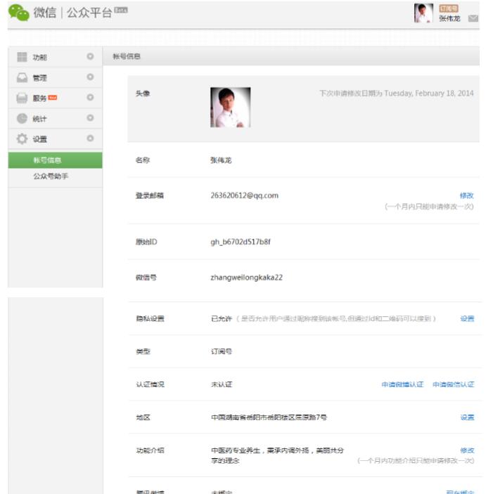 設置微信公眾平臺信息。 登陸后,左側共有五個選項分別為【功能】【管理】【服務】【統(tǒng)計】【設置】 點擊【設置】里的【賬號信息】:以下是需要更改的要點(見下圖)